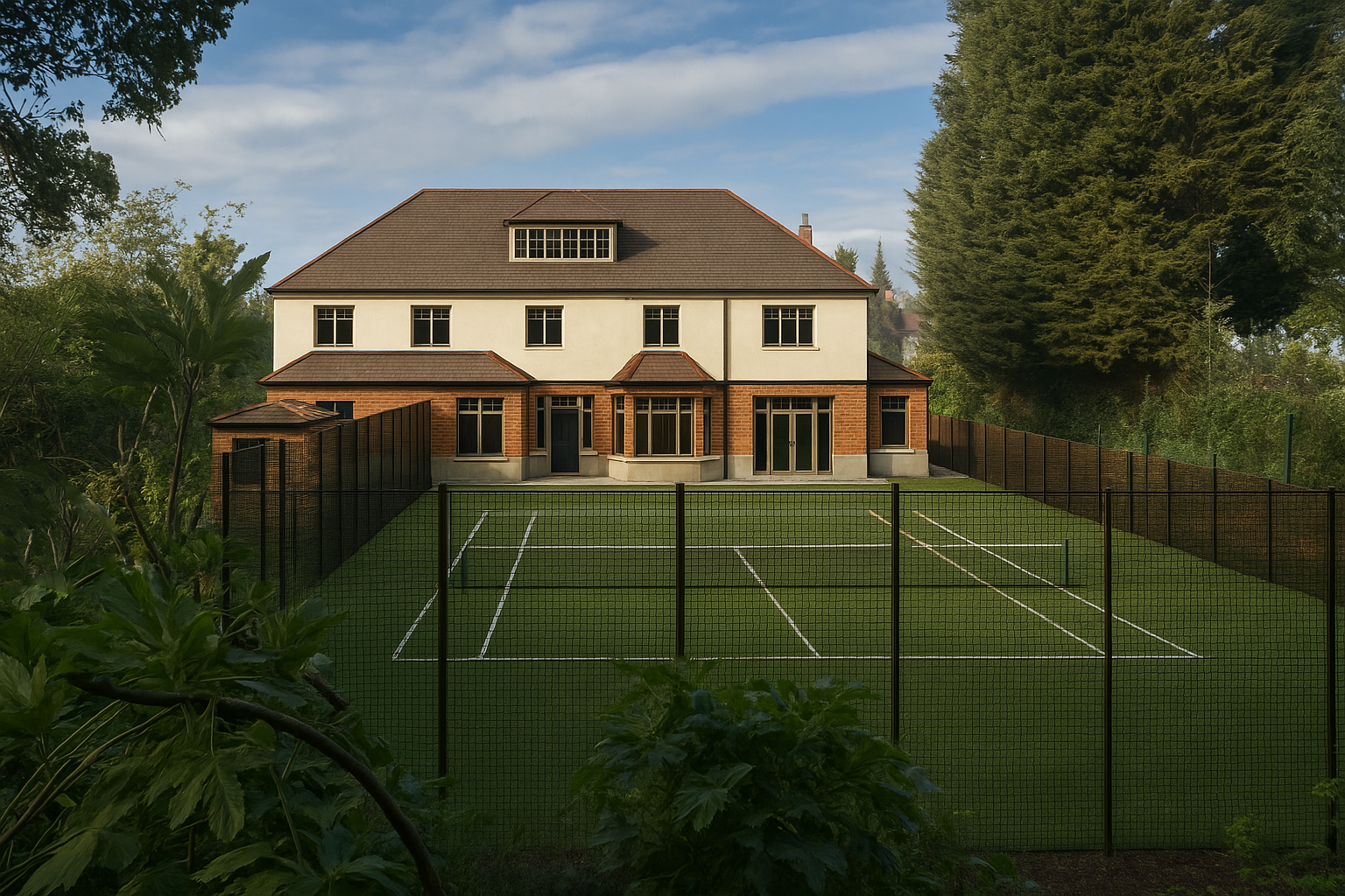 Our clients desired a large expansive family-living and media area, study, kitchen- dining area and additional bedrooms each with ensuites on the above floors. We proposed a new single, double storey and roof extension and landscaped grounds. With bi-fold doors opening out onto a landscaped garden with mature protected trees, a tennis court, gymnasium and swimming pool.